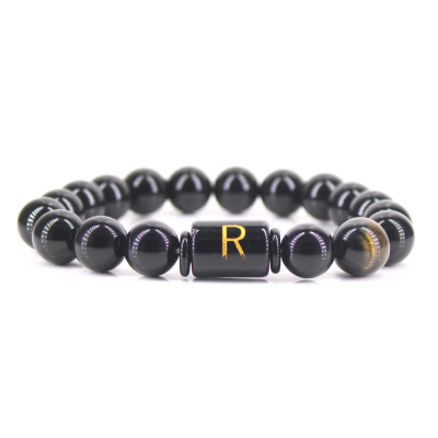 Βραχιόλι με Ορυκτές Πέτρες Black Obsidian & Tiger Eye Μονόγραμμα R