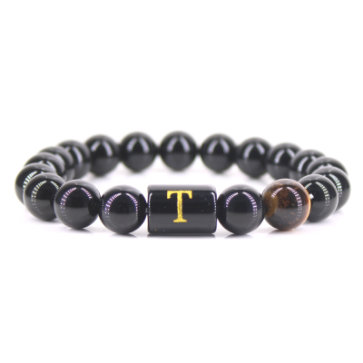 Βραχιόλι με Ορυκτές Πέτρες Black Obsidian & Tiger Eye Μονόγραμμα T