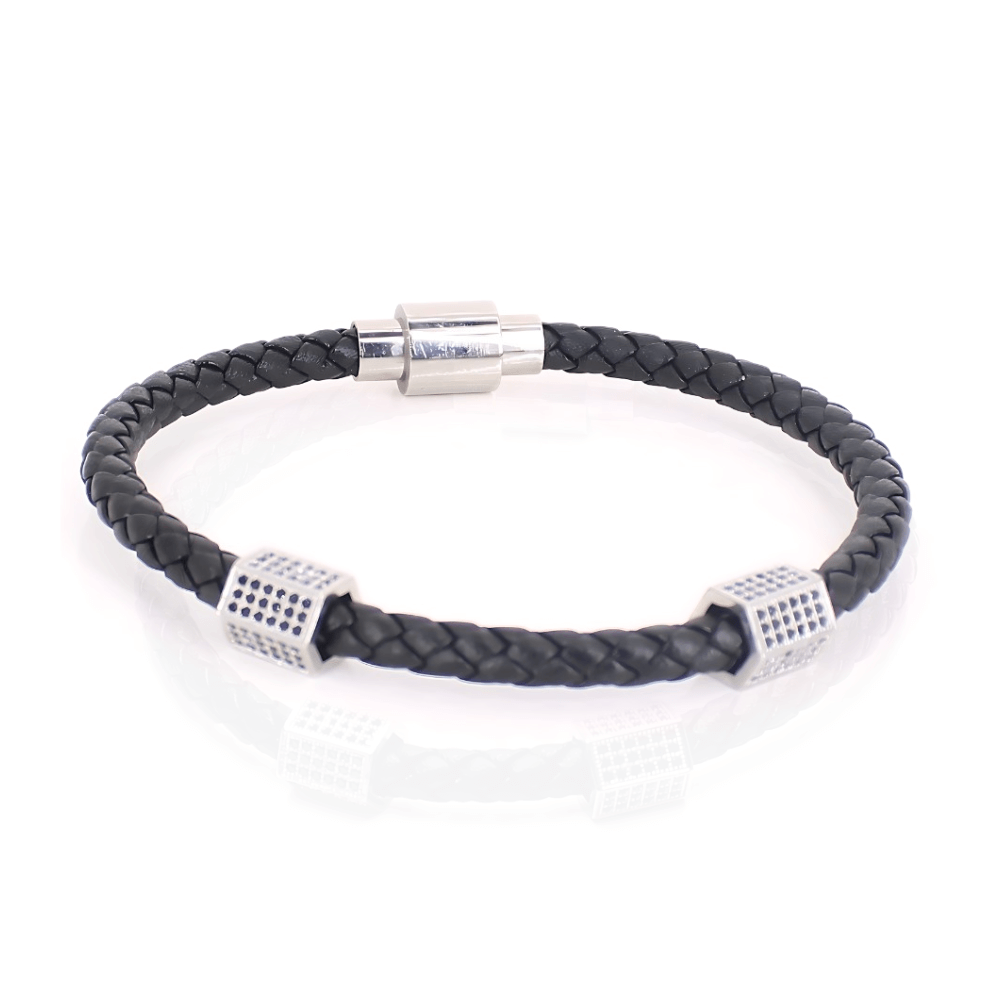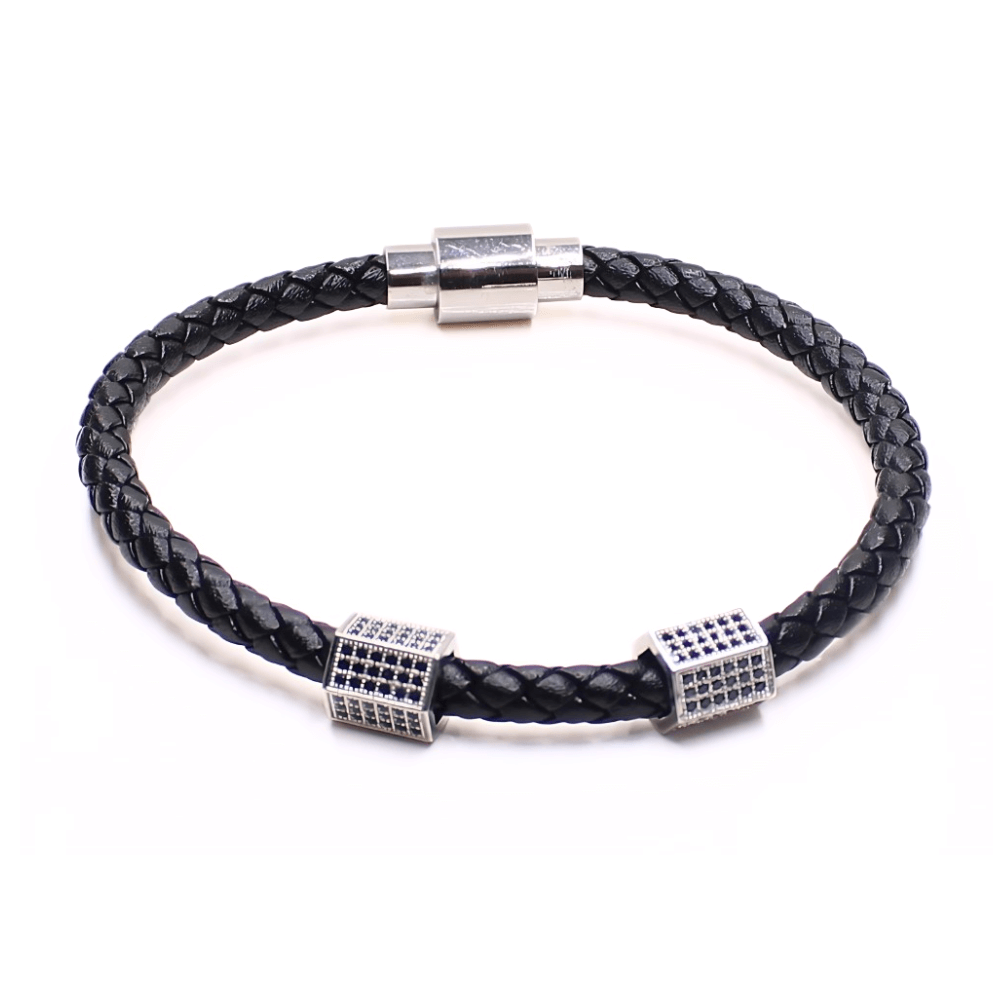 Ανδρικό βραχιόλι μαύρο με δύο στοιχεία ασημί και μαύρες πέτρες . Μέγεθος 20,50cm